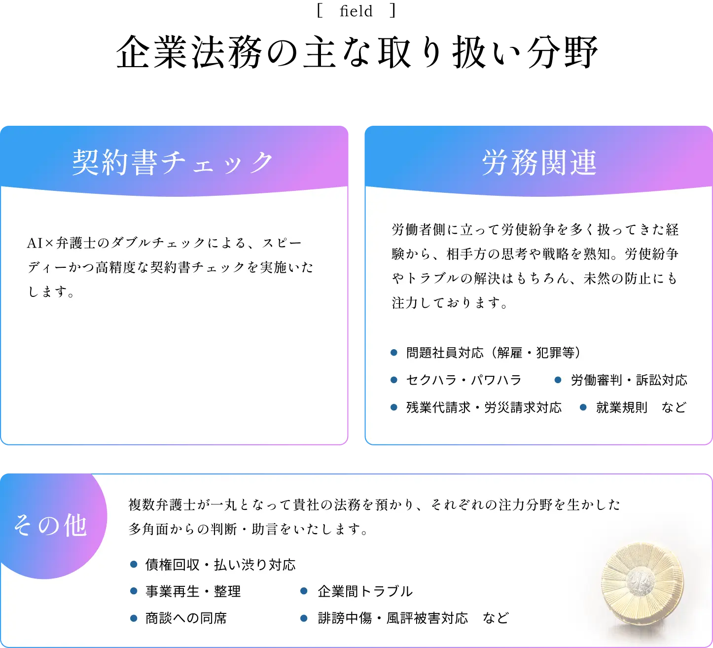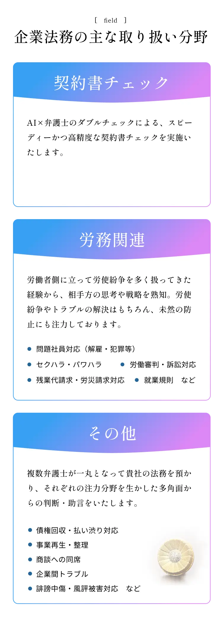 労使紛争案件を多く経験しており、人事・労務に関しては社会保険労務士の分野まで精通しています。